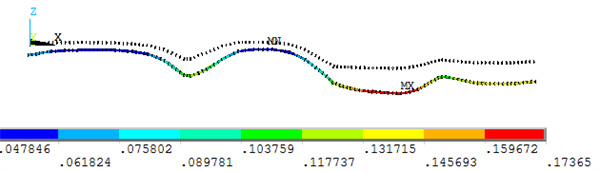 高填方區管道除了受內壓、溫差、走向變化影響外,同時(shí)受土體不均勻沉降的作用;輸氣管道最大位移范圍為0.04 m~0.17 m,最大應力點(diǎn)組合應力值為254 MPa(圖 5),最大組合應力雖略有增高,但遠小于X80鋼管材質(zhì)允許極限應力值(499.5 MPa),可判定管道運營(yíng)處于安全狀態(tài)。
