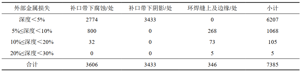 陜京一線(xiàn)管道建成投產(chǎn)于1997年,2018年對其中約100公里管道開(kāi)展了第三輪內檢測,發(fā)現補口帶下異常7385處,與上一次檢測相比,補口帶下異常位置明顯增加。對管道補口存在的異常位置和特征進(jìn)行統計,詳見(jiàn)表 1。