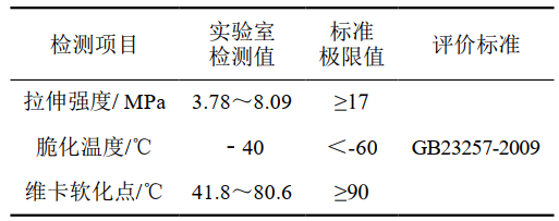 補口帶外觀(guān)形貌普遍完好。實(shí)驗室檢測結果表明,補口帶的拉伸強度、脆化溫度和維卡軟化點(diǎn)檢測值均低于標準要求范圍(表 2),且補口帶存在斷層現象,綜合檢測結果表明補口帶老化程度較為嚴重。