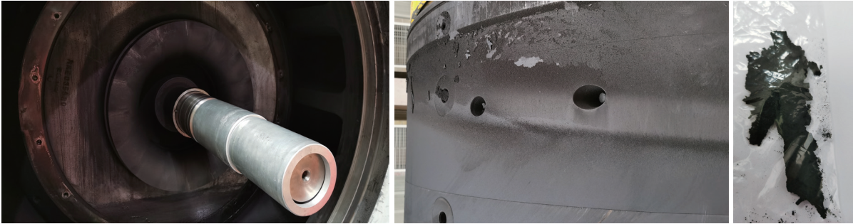 研究樣本選擇于2011年11月投產(chǎn)的RF4BB36型離心式壓縮機組,累積運行52327小時(shí)。2022年6月進(jìn)行50 K自主維保,拆卸壓縮機定子與轉子過(guò)程中,在壓縮機出氣壁、定子內外部與轉子周邊發(fā)現大量結垢,呈黑色固體連續相(圖 2)。