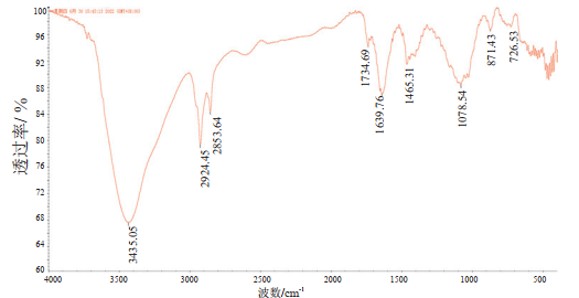 紅外光譜分析結果如圖 4所示,3435 cm-1、2924 cm-1、2853 cm-1、1734 cm-1、1639 cm-1、1465cm-1、1078cm-1、871cmcm-1、726cm-1、處的吸收峰分別對應C-H,O-H,N-H;C-H;C=O,C-H;C-H,C=O;C=C,N-H,C=N,N=N,N=O;C-H;C-O,C-O-C,C-H;C-H;C-H,O-H。