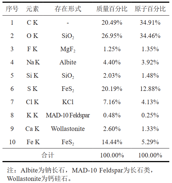 結垢樣本組分分析結果如表 1所示。從表 1可知,結垢化學(xué)成分主要為SiO2(26.95%)、FeS2(34.63%)、MgF2(1.25%)、KC1(7.16%)、Wollastonite(2.60%)、MAD-10 Feldspar(0.48%)等,此外還有Carbon fraction(碳組分24.90%)。