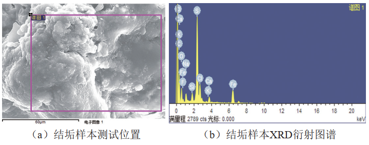 掃描電鏡得到的結垢樣本形貌如圖 3所示,可知結垢由微米級別的顆粒組成,形態(tài)主要為針狀/棒狀和球狀等不規則塊狀,分別是方解石、文石和球霰石的典型形貌,文石是SiO2晶體中最穩定的相。結垢混合物緊密排列,結垢層非常致密。