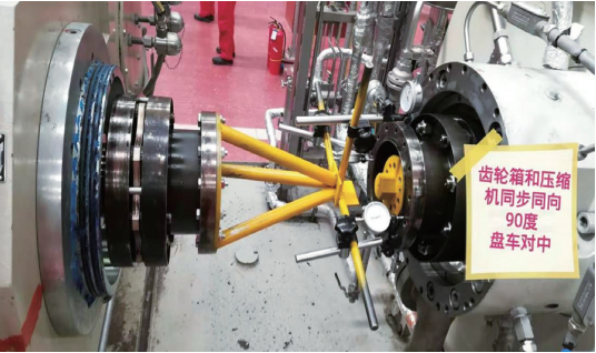 (6)找正完畢后,可以預組裝聯(lián)軸器。由于壓縮機、變速箱及電機等有各自獨立的推力系統,必須按照壓縮機組圖紙要求預留聯(lián)軸器安裝間距,且此間距應在各轉子主推力面上進(jìn)行測量,以保證其膨脹間隙,這一點(diǎn)對機組長(cháng)周期運行至關(guān)重要。