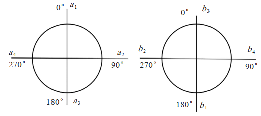 (2)按照齒輪箱旋轉方向盤(pán)車(chē),旋轉至90°、180°、270°,分別記錄百分表讀數(圖 3, a、b各代表百分表測量的對中偏差值讀數),并計算得出偏差值S:S1=(a1+b3)/2;S2=(a2+b4)/2;S3=(a3+b1)/2;S4=(a4+b2)/2。