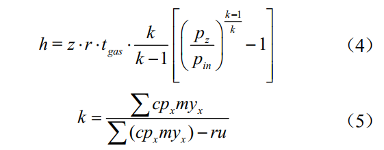 離心式壓縮機的能頭及絕熱系數計算分別見(jiàn)式(4)、式(5):