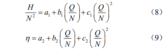 壓縮機特性曲線(xiàn)是指在進(jìn)氣狀態(tài)一定的條件下,轉速、多變效率與進(jìn)氣量之間的關(guān)系,反映機組運行時(shí)工況的變化,通常用特性方程來(lái)表征特性曲線(xiàn)。離心壓縮機的特性方程見(jiàn)式(8)、式(9)[10]: