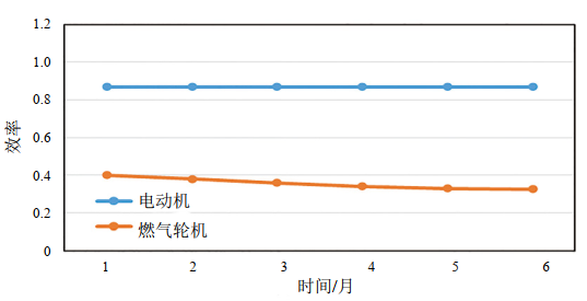 電動(dòng)機的性能受環(huán)境影響較小,而燃氣輪機的性能受環(huán)境影響比較大,溫度升高熱效率會(huì )下降,驅動(dòng)機效率如圖 4所示。