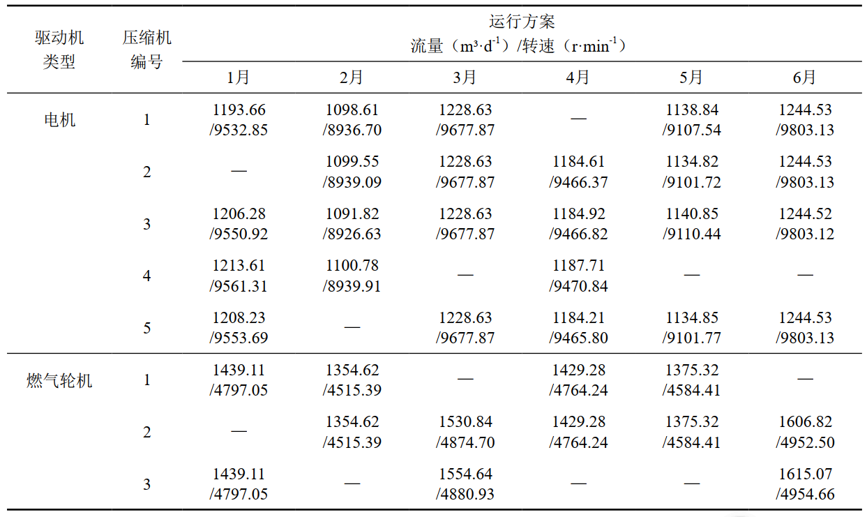 優(yōu)化后得到了詳細的壓縮機組運行方案,如表 5所示,據此可以調整壓氣站壓縮機組運行策略。例如,1月時(shí),依據求得的轉速,運行電驅1、3、4、5號機以及燃驅1、3號機最優(yōu)。