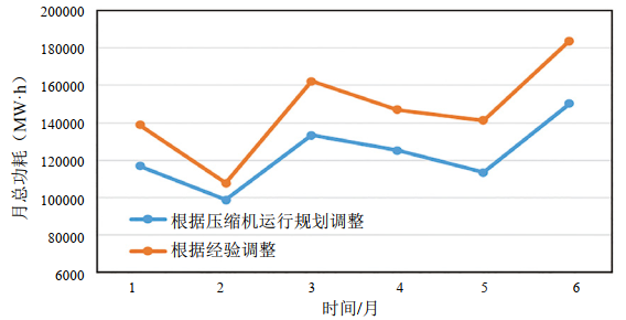 優(yōu)化后機組總能耗與根據經(jīng)驗制定運行方案的機組總能耗對比如圖 5所示,可以看出,合理決策壓縮機的運行方案能夠降低能耗,節省運行成本,減少碳排放。對現場(chǎng)調整機組運行方案具有指導意義。