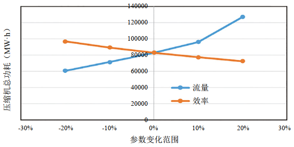 考慮到輸氣指定量、驅動(dòng)機效率的不確定性,利用控制變量法進(jìn)行了敏感性分析,以量化當其他參數保持在基準值時(shí),每個(gè)單獨參數對機組總能耗的影響。由圖 6可以看出,機組總能耗與輸氣量呈正相關(guān),與驅動(dòng)機效率呈負相關(guān),輸氣指定量對機組總能耗的影響較大,但驅動(dòng)機效率的影響仍不容小覷。