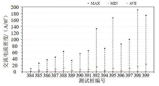 (2)在管道交流干擾峰值的2個(gè)位置采取干擾防護措施,可將全線(xiàn)管道的交流電流密度降至30 A/㎡內,建議在388#和393#測試樁處增加70 m和40 m鋅帶排流措施。