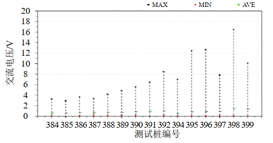 管道交流電壓和交流電流密度測試結果見(jiàn)圖 3,管道沿線(xiàn)的交流電壓在0~16.47 VCSE,交流電流密度平均值分布在2.06 A/㎡~23.65 A/㎡。圖 4為391#測試樁24 h交流電壓測試結果,結果顯示此段管道存在動(dòng)態(tài)交流雜散電流干擾,在白天時(shí)間段交流電壓和電流密度波動(dòng)較大,夜間時(shí)間段波動(dòng)較小,判斷目前管道的交流干擾主要是電氣化鐵路造成的。