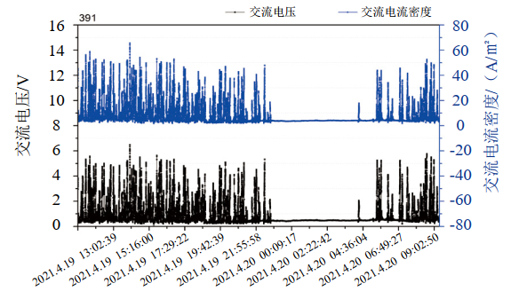 圖 4 391#測試樁24 h交流電壓和電流密度波動(dòng)圖