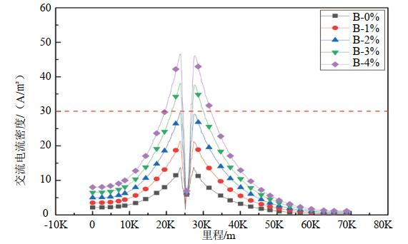 交流輸電線(xiàn)路正常運行時(shí),由于電壓波動(dòng)導致三相電流不平衡,GB/T 15543-2008《電能質(zhì)量三相電壓不平衡》規定“電網(wǎng)正常運行時(shí),長(cháng)時(shí)電壓不平衡度不超過(guò)2%,短時(shí)不得超過(guò)4%”。在B相線(xiàn)路與其他二相存在不同不平衡度時(shí),管道沿線(xiàn)的交流電壓和交流電流密度的模擬計算結果見(jiàn)圖 5。結果顯示,輸電線(xiàn)路B相不平衡度達到4%時(shí),管道交流電壓達到3.1 V,交流電流密度達到46.599 A/㎡,交流電壓峰值出現在輸電線(xiàn)路開(kāi)始并行和結束并行的位置。輸電線(xiàn)路的三相不平衡度越高,對管道的交流干擾越大,在輸電線(xiàn)路的B相不平衡度大于2%時(shí),管道沿線(xiàn)部分位置的交流電流密度高于30 A/㎡。