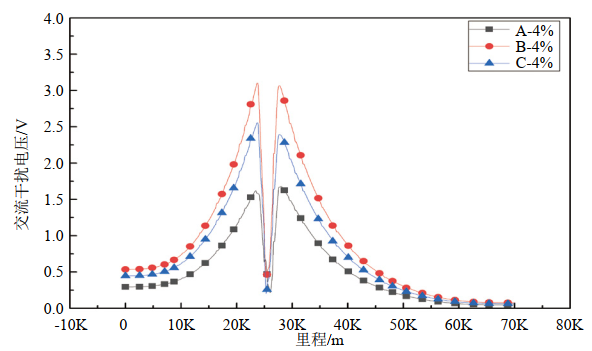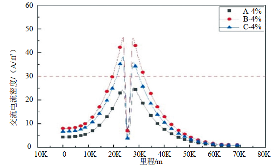 在不同相位的不平衡度分別達到4%,管道沿線(xiàn)的交流電壓和交流電流密度模擬計算結果見(jiàn)圖 6。結果顯示,不同相保持不平衡度時(shí),管道的交流干擾程度差異性較大,其中在B相不平衡度為4%時(shí),管道受到的交流干擾最大。