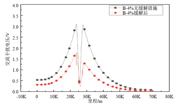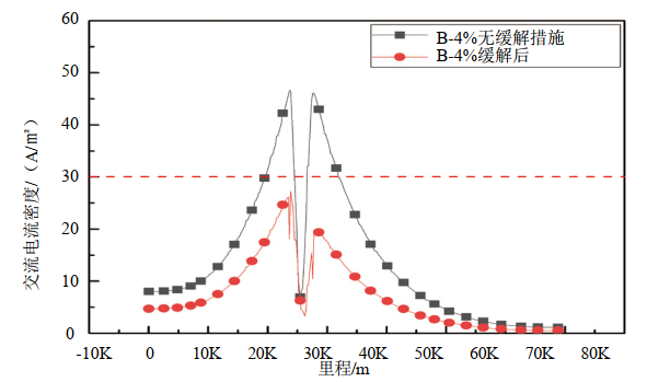 在輸電線(xiàn)路B相不平衡度為4%時(shí),管道部分位置的交流電流密度高于30 A/㎡,根據國內外評價(jià)指標規定,本次干擾緩解目標為輸電線(xiàn)路造成的交流電流密度小于30 A/㎡。