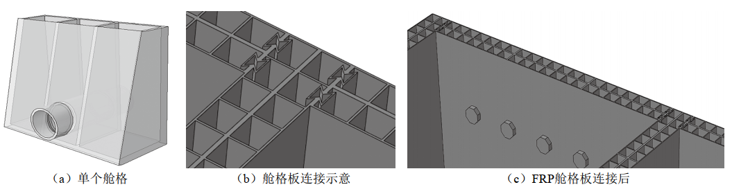 為克服當前截水墻存在的不足,需要開(kāi)發(fā)一種經(jīng)濟合理、施工便捷、材料易取的新型截水墻。東南大學(xué)等[2]提出應用纖維增強復合材料(Fiber reinforced polymer,FRP)的裝配式艙格截水墻專(zhuān)利技術(shù)。FRP艙格截水墻由FRP薄壁艙格和填土兩部分組成,FRP艙格由FRP空腹板通過(guò)膠黏和螺栓連接而成,設計成梯形,用于容納填土,如圖 4所示。填土可采用棄土、廢棄礦渣等價(jià)格低廉填料。