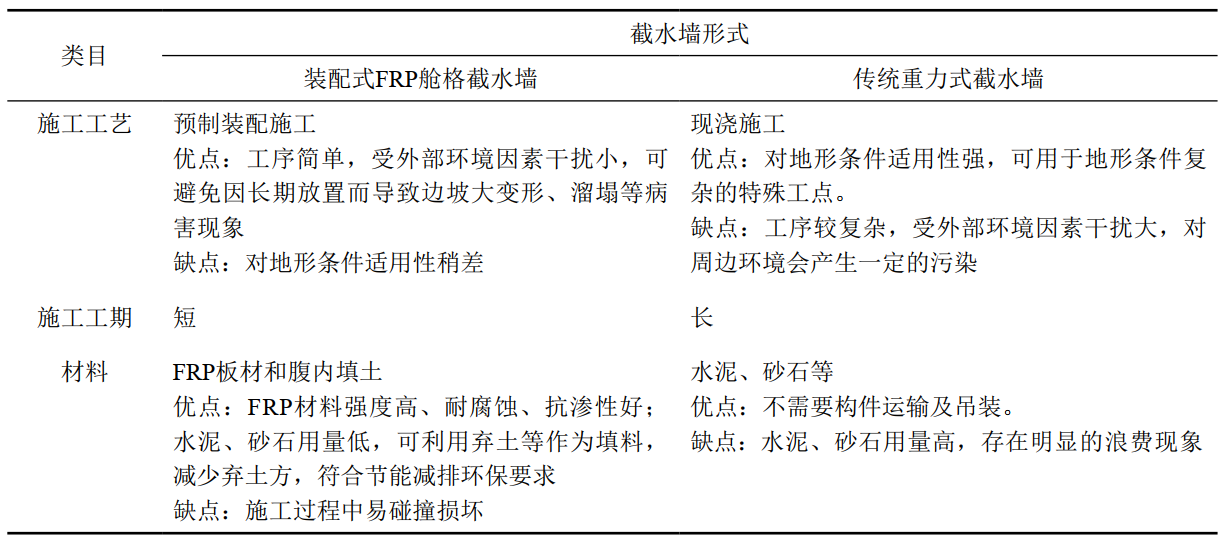 該截水墻的設計荷載與重力式截水墻基本一致,區別是空腹薄壁艙格需考慮箱體內填土的土壓力,這是艙格尺寸設計的主控力,艙格內填土的土壓力可參考貯倉土壓力理論進(jìn)行計算;抗滑、抗傾覆穩定性計算與重力式截水墻相同。裝配式FRP艙格截水墻與傳統重力式截水墻在施工準備、放線(xiàn)、溝壁開(kāi)槽階段工序相同[3],在施工工藝和材料上存在差異,如表 1所示。