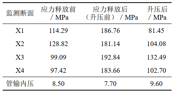 (3)施工過(guò)程中,在隧道洞口彎頭上下游布置監測點(diǎn)。應力監測結果表明,管輸內壓對于管道應力變化影響明顯。同等壓力工況下對比,實(shí)施治理措施后管道應力水平得到一定程度的降低,應力安全裕量得以提升,如表 1所示。