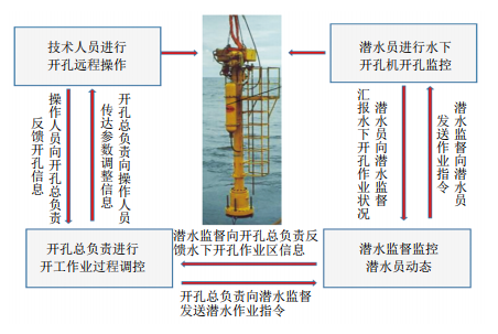 與此同時(shí),潛水人員潛入水下輔助及監控開(kāi)孔機作業(yè),潛水監督在潛水控制室通過(guò)實(shí)時(shí)監控系統與潛水員保持溝通并指揮潛水人員作業(yè)。潛水監督與開(kāi)孔總負責實(shí)時(shí)對接并接收作業(yè)指令和發(fā)送作業(yè)指令,同時(shí)監控潛水人員動(dòng)態(tài)。開(kāi)孔作業(yè)流程及管控如圖 2所示。