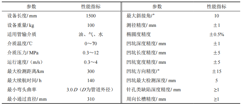 根據需求,基于脈沖渦流原理對管道進(jìn)行金屬損失檢測,同時(shí)集幾何測徑和管道中心線(xiàn)測繪功能于一體,研制一套適用于管徑406 mm雙金屬管道的專(zhuān)項復合檢測器(以下簡(jiǎn)稱(chēng)專(zhuān)項檢測器)。通過(guò)高密度渦流傳感器和高采樣率對內襯管腐蝕情況進(jìn)行準確檢測和尺寸確定,用幾何測徑傳感器進(jìn)行高精度幾何測徑和凹痕尺寸檢測。最終確定檢測器的總體設計方案和各項參數性能指標(表 1)。