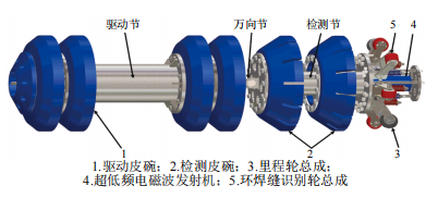 專(zhuān)項檢測器主體結構按功能劃分為驅動(dòng)節和檢測節,兩節之間由萬(wàn)向節串聯(lián)連接。驅動(dòng)節前、后共裝有4個(gè)碟形驅動(dòng)皮碗,最大皮碗間距為1.6 D(為管道外徑),驅動(dòng)皮碗過(guò)盈量4.7 %用以密封管輸介質(zhì),提供驅動(dòng)力和支撐整節結構重量。驅動(dòng)節的耐壓艙體內裝有鋰電池供電系統提供電能。檢測節主要由兩個(gè)交錯安裝的檢測皮碗、里程輪總成、環(huán)焊縫識別輪總成、支撐輪總成、超低頻電磁波發(fā)射機等組成。檢測節的耐壓艙體內裝有電子系統和管道中心線(xiàn)測繪單元,如圖 3所示。