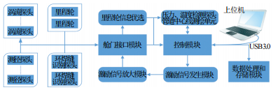 檢測器電子系統采用模塊化設計[12],按照功能劃分為控制模塊、激勵信號發(fā)生模塊、激勵信號放大模塊、艙門(mén)接口模塊、數據處理和存儲模塊等[13],內部還集成了壓力、溫度和管道中心線(xiàn)測繪單元。渦流探頭與測徑探頭等通過(guò)艙門(mén)結構模塊與電子系統相連,如圖 6所示。