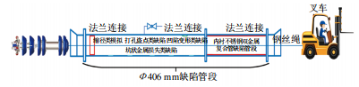 為驗證專(zhuān)項檢測器的各項性能指標是否滿(mǎn)足設計要求,開(kāi)展了專(zhuān)項檢測器在缺陷管道內的牽引測試。缺陷管道由多根管徑為406 mm的管道組成,一部分為常規壁厚的普通鋼制管道,一部分為包含內襯不銹鋼的雙金屬復合管道組成。每種管道上均包含縮徑、打孔盜點(diǎn)、凹陷變形和坑狀金屬損失等人工缺陷,另外雙金屬復合管內還存在部分內襯層與外基管剝離塌陷、褶皺變形類(lèi)的人工缺陷,如圖 7所示。