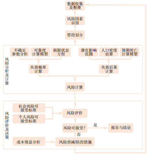 定量風(fēng)險評價(jià)(Quantitative Risk Assessment,QRA)是將管道的失效概率和失效后果進(jìn)行定量計算,通過(guò)數值表明所評價(jià)對象的危險程度,實(shí)現對管道風(fēng)險的精確描述,以便科學(xué)地確定風(fēng)險防控和消減措施,最大限度減少事故發(fā)生所造成的經(jīng)濟損失、人員傷亡和對環(huán)境的破壞。定量風(fēng)險評價(jià)結果的精度取決于數據資料的完整性和精度、數學(xué)模型和分析方法的合理性。評價(jià)過(guò)程主要包括數據收集、風(fēng)險識別、管段劃分、失效概率和失效后果計算、風(fēng)險計算、風(fēng)險評價(jià)和決策等,其核心是管道失效概率和失效后果的計算。