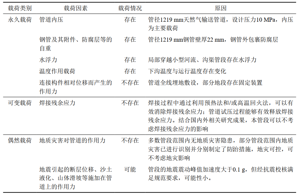 中俄東線(xiàn)天然氣管道(永清—上海)為埋地敷設,在運行過(guò)程中可能同時(shí)出現永久載荷、可變載荷和偶然載荷。結合泰安—泰興段管道的敷設情況,對上述可能出現的載荷分析如表 1所示。