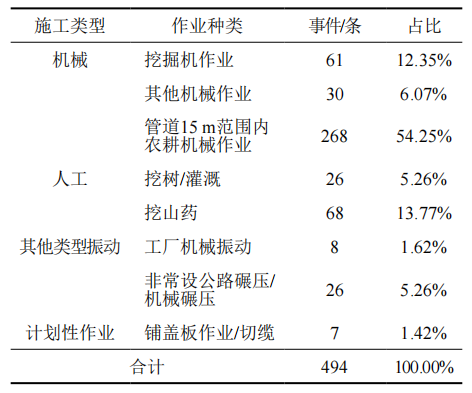 通過(guò)事件復核及現場(chǎng)反饋,全年共發(fā)現預警事件494次,其中主要為機械施工占比72.67%(圖 3),人工挖掘施工占比19.01%。表明預警能夠對機械事件和人工深層次挖掘、持續性挖掘及作業(yè)計劃事件進(jìn)行準確預警與定位。