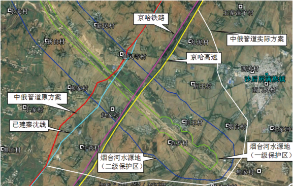 圖 1 中俄東線(xiàn)穿越煙臺河水源地保護區示意圖