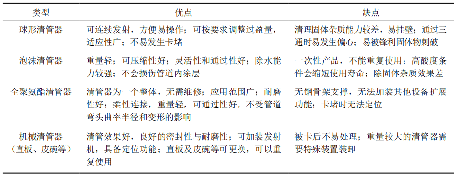 清管器因外形、材質(zhì)、尺寸等差異而具有不同的動(dòng)力學(xué)特性和優(yōu)缺點(diǎn),適用性比較見(jiàn)表 2。要根據現場(chǎng)條件,綜合分析不同類(lèi)型清管器特點(diǎn)選用適用于解堵的清管器,以達到最佳解堵效果,降低解堵風(fēng)險。