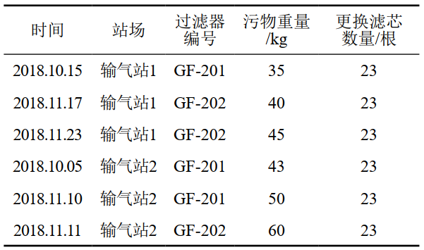 (1)過(guò)濾分離器濾芯更換情況。2018年5—11月兩個(gè)輸氣站過(guò)濾分離器濾芯更換記錄顯示, 5—9月沒(méi)有進(jìn)行更換,而10—11月每站更換3次(表 2)。