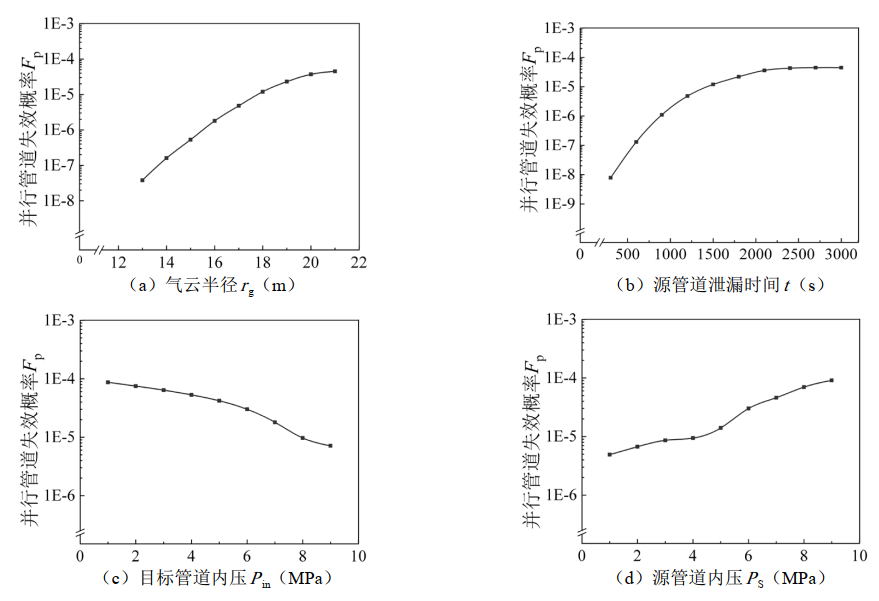 在管道運行階段,泄漏氣云半徑及管道內壓為并行管道失效概率主要影響因素。如圖 2(a)所示,氣云半徑與并行管道失效概率呈正相關(guān)關(guān)系。而氣云半徑大小主要取決于源管道泄漏時(shí)間,為探究該參數與并行管道失效概率之間的關(guān)系,基于文獻[2]的管道燃氣泄漏擴散模型,獲得源管道泄漏時(shí)間與并行管道失效概率關(guān)系曲線(xiàn)。如圖 2(b)所示,并行管道失效概率隨著(zhù)源管道泄漏時(shí)間的增加而逐漸增大。在源管道泄漏時(shí)間較短時(shí),泄漏氣云半徑相對較小,因此目標管道失效概率及并行管道失效概率均較小。而在源管道發(fā)生泄漏約2200 s后,由于其產(chǎn)生的爆炸載荷超出管道可承受的臨界值,導致目標管道必然發(fā)生失效,目標管道失效概率值趨近于1,此時(shí),并行管道失效概率主要取決于源管道失效概率。由圖 2(c)和(d)可知,增高目標管道內壓促使管道抵抗外部載荷的能力增強,從而有利于使并行管道失效概率下降,而增大源管道內壓,使源管道失效泄漏時(shí)燃氣的泄放速率上升,增加了源管道燃氣泄漏量,目標管道失效概率增大,進(jìn)而使并行管道失效概率上升。