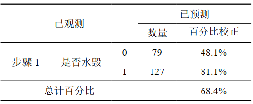 選取的指標有:高程X1、管道走向X2、積水影響長(cháng)度X3、地表徑流與管道關(guān)系X4、地形地貌X5、管道埋深X6。將數據帶入Logistic回歸模型進(jìn)行擬合,其中地表徑流與管道關(guān)系定義為分類(lèi)變量,0表示否,1表示是。分類(lèi)截止值設定為0.5。擬合后預測正確度統計如表 1所示,結果可知Logistic預測正確率高達81.1%,預測效果較好。