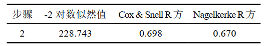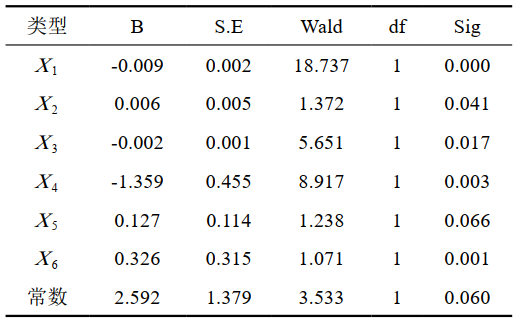 Cox & Snell R方和Nagelkerke R方檢驗結果參數表示模型的變量對因變量的解釋能力,取值為0~1,越接近1解釋能力越好。如表 2所示檢驗結果均大于0.5,說(shuō)明具有較好的擬合程度。