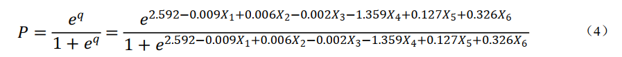 將常數、X1-X6自變量系數帶入式(3),q=2.592-0.009X1+0.006X2-0.002X3-1.359X4+0.127X5+0.326X6。最終得出水毀災害易發(fā)性概率計算模型如下:
