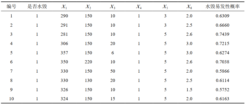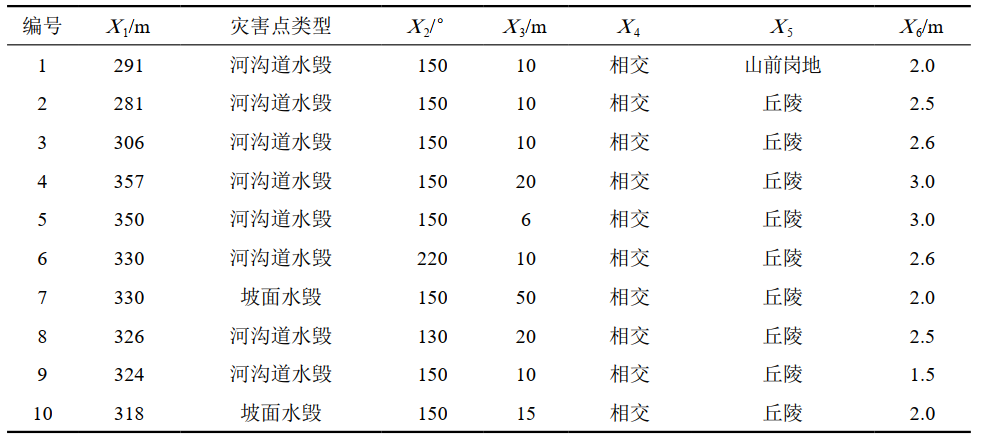 研究樣本為某長(cháng)輸管道年度地質(zhì)災害專(zhuān)業(yè)化排查數據,地質(zhì)災害隱患點(diǎn)主要包括河溝道水毀、坡面水毀、臺田地水毀等。野外調查時(shí)數據源采集參數包括里程、經(jīng)度、緯度、高程、災害點(diǎn)類(lèi)型、土質(zhì)類(lèi)型、植被類(lèi)型、管道走向、積水影響長(cháng)度、地表徑流與管道關(guān)系、地形地貌、管道狀況、管道埋深等。如表 4所示,選取高程X1、管道走向X2、積水影響長(cháng)度X3、地表徑流與管道關(guān)系X4、地形地貌X5、管道埋深X6六個(gè)指標數據進(jìn)行概率預測。