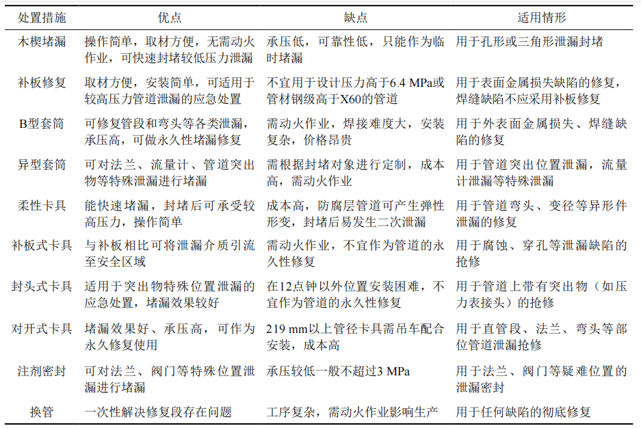 油氣管道泄漏搶修常用木楔、柔性?shī)A具、B型套筒、注劑密封等封堵修復,或采取換管永久修復。表 1比較了各種搶修處置措施的優(yōu)缺點(diǎn)及適用情形。