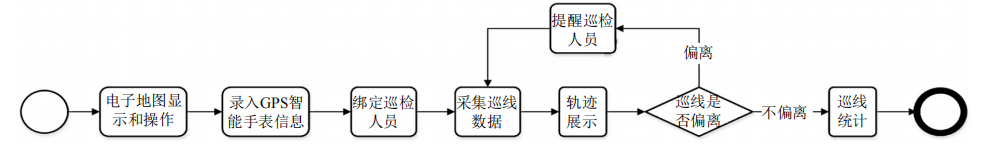 (3)工作流程。首先錄入GPS智能手表信息,然后將其與巡檢人員綁定。巡檢人員佩戴手表巡線(xiàn),手表自動(dòng)記錄巡線(xiàn)數據。系統采集巡線(xiàn)數據并展示巡線(xiàn)軌跡,巡線(xiàn)偏離提醒,統計巡線(xiàn)數據,實(shí)現巡線(xiàn)軌跡查看等功能。工作流程如圖 2所示。