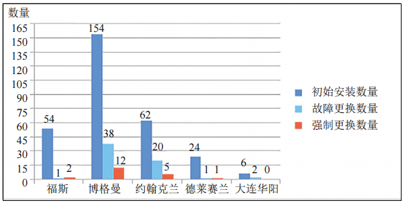 如針對西二、三線(xiàn)永昌和古浪站聯(lián)合運行多重因素造成的干氣密封故障問(wèn)題,統計了各站場(chǎng)不同廠(chǎng)家的干氣密封故障更換數量或強制更換數量,與初始安裝數量進(jìn)行了對比,結果如圖 2所示。