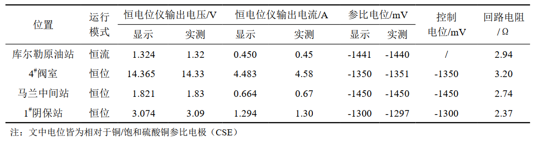 庫鄯管道共有4套陰極保護系統,分別位于庫爾勒原油站、4#閥室、馬蘭中間站、1#陰極保護站。表 1檢測結果表明,4臺恒電位儀實(shí)際輸出電流、輸出電壓、參比電位與儀表面板顯示基本一致,恒電位儀均正常。