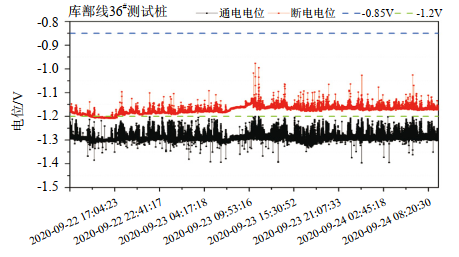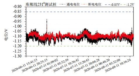 結果表明,庫鄯管道通電電位在﹣2.111 V~ ﹣0.193 V之間波動(dòng),斷電電位皆負于﹣0.85 V。依據國標GB 50991―2014《埋地鋼質(zhì)管道直流干擾防護技術(shù)標準》,管道均處于有效保護狀態(tài)。