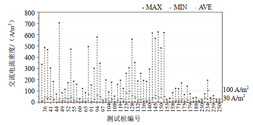 GB/T 50698―2011規定,管道交流干擾電壓不高于4 V時(shí),可不采取交流干擾防護措施;高于4 V時(shí),應采用交流電流密度進(jìn)行評估;管道受交流干擾程度“強”“中”“弱”判定指標分別為:>100 A/m2,30 A/m2~100 A/m2,<30 A/m2;“強”應采取交流干擾防護措施;“中”宜采取交流干擾防護措施;“弱”可不采取交流干擾防護措施。