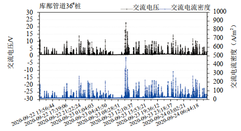 圖 7 庫鄯管道36#測試樁72 h管道交流電壓和交流電流密度波動(dòng)圖