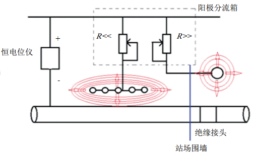 (1)根據SYT 6964―2013《石油天然氣站場(chǎng)陰極保護技術(shù)規范》,在泵棚區、閥組區等欠保護區域增設淺埋陽(yáng)極,并通過(guò)陽(yáng)極分流箱并入現運行的深井陽(yáng)極。