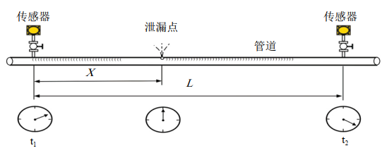 次聲波泄漏監測通過(guò)計算泄漏信號傳輸到安裝在管段兩端傳感器的時(shí)間差,結合信號在流體中的傳輸速度,計算泄漏點(diǎn)位置,如圖 1 所示。