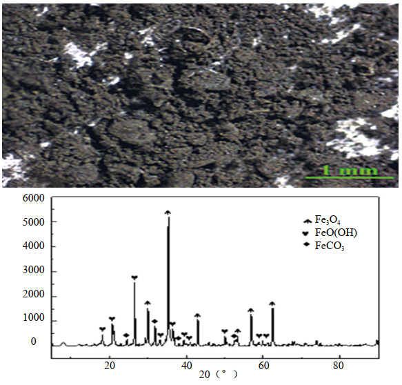 (4)磁性晶體粉末影響檢測器運行。使用體視顯微鏡(Zeiss Stemi 508)觀(guān)察黑色粉末宏觀(guān)形貌等,可見(jiàn)粉末細微,少量粉末團聚成球狀;使用X射線(xiàn)衍射儀分析其成分,主要成分為Fe3O4,FeO(OH)和FeCO3,如圖 5所示。Fe3O4為具有磁性的黑色晶體,漏磁檢測器若去掉漏磁探頭就是一個(gè)具有超強磁力的鋼刷清管器,在其運行過(guò)程中,兩側鋼刷將管道內壁金屬氧化物刷下來(lái),一部分吸附在漏磁探頭兩側的強磁鐵上,一部分堆積在檢測器前段,使得漏磁檢測器需要比正常0.2 MPa壓差更大的驅動(dòng)力。磁性氧化物粉末細微,硬度高,對皮碗的磨損嚴重。